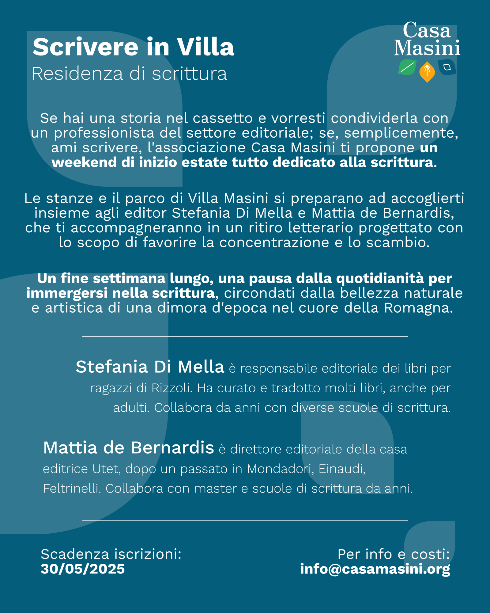 Se hai una storia nel cassetto e vorresti condividerla con un professionista del settore editoriale; se, semplicemente, ami scrivere, l’associazione Casa Masini ti propone un weekend di inizio estate dedicato tutto alla scrittura.